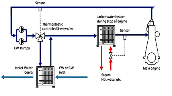 During port stay or anchorage, cooling isn’t needed — but standard 3-way valves